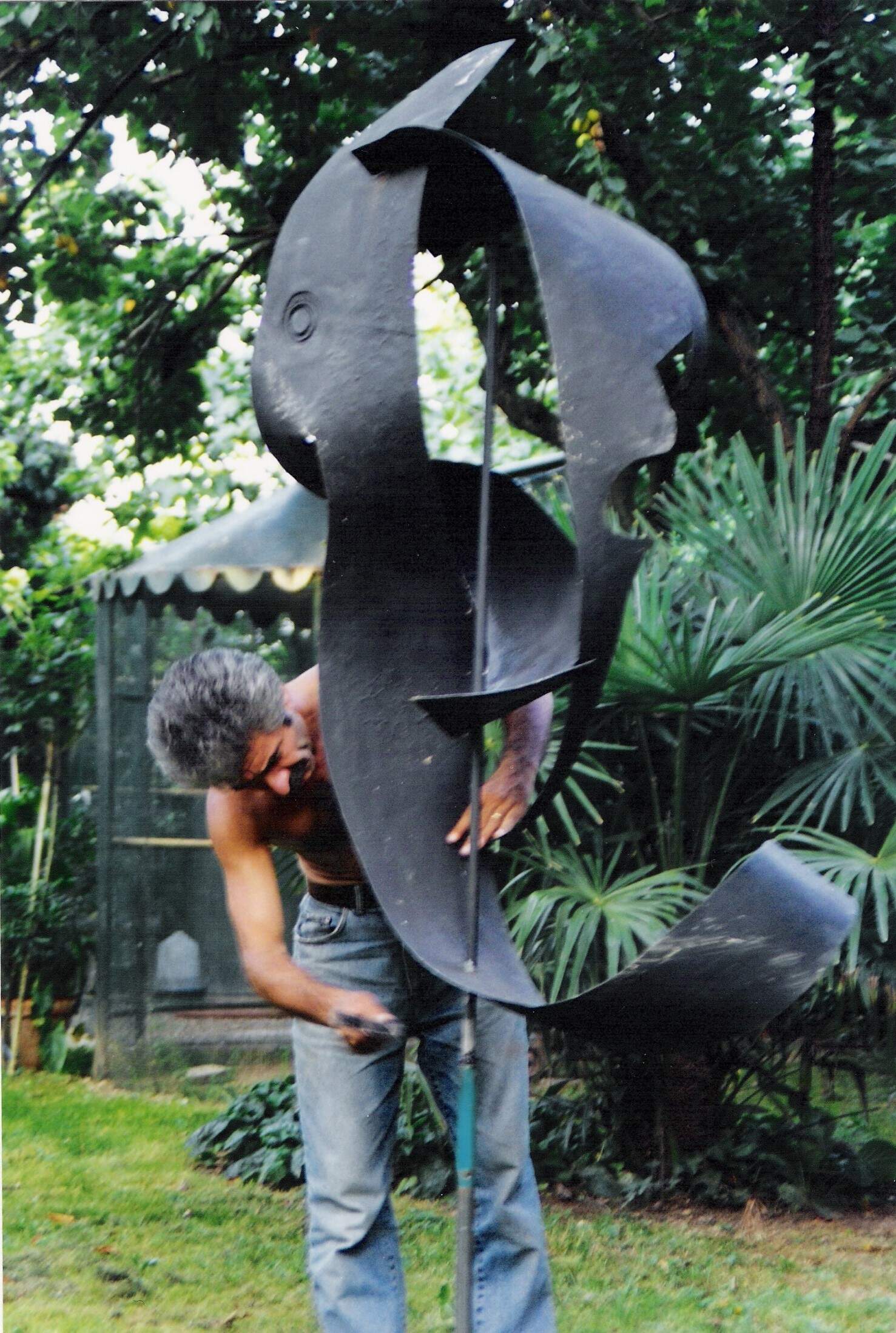 Descrizione: Lamiera metallica da bidone di olio “Shell” recuperato sul posto, asta in ferro su perno di rotazione; vernice grigio antracite. Il contenitore cilindrico d’uso pratico è trasformato da una meditata scomposizione e apertura delle superfici curve ricomposte in una nuova figura spaziale sull’asse metallico centrale rotante, uniformata dal colore grigio antracite, che esprime un inedito valore estetico-dinamico e poetico. Il tappo originario è segno di identificazione dell’oggetto rinvenuto.